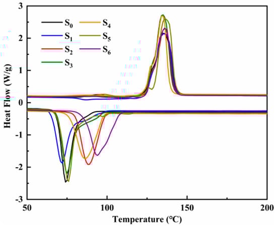 To explore the heat transfer performance of the modified nitrate, the samples S0, S2, S4, and S6 were placed on a heating plate, and an infrared thermal imaging instrument was used to characterize the heat transfer performance of the material. Figure 9 shows the infrared thermal images of samples S0, S2, S4, and S6 heated on the heating plate for different times. The heat is transferred upward from the bottom end. The heat transfer rate from sample S0 to sample S6 shows an increasing trend, and the transfer rate of sample S6 is the fastest at the same time. Plot the temperature of samples S0, S2, S4, and S6 at the same geometric position with heating time, as shown in Figure 10. It can be seen that the heat transfer performance of the material increases with the increase of MgO nanoparticles. The doping of nanoparticles enables the material to transfer heat in the solid state quickly, accelerating the heat transfer process of the material, thus shortening the time required for the phase change of the material, and more efficiently storing thermal energy. At the same time, when the material acts as a nanofluid in a liquid state, the heat transfer performance is greatly improved, and the heat transfer process is accelerated. The results show that modified nitrate has high sensible heat and latent heat, a suitable phase transition temperature, and high thermal conductivity, which can improve the energy storage efficiency and can be used in thermal energy storage systems.