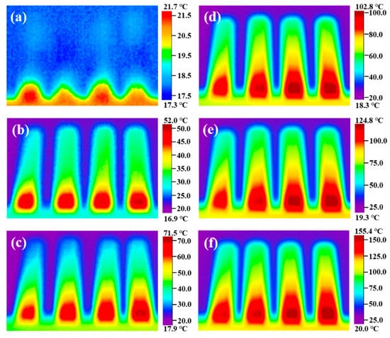 Infrared thermography images of samples S0, S2, S4, and S6 heated on the heating plate for different times: (a) 0 s, (b) 60 s, (c) 120 s, (d) 180 s, (e) 240 s, and (f) 300 s.