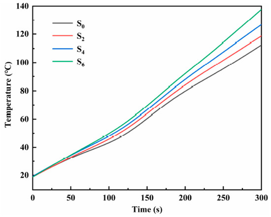 The temperature variation curve of the same geometric position of samples S0, S2, S4, and S6 with heating time.