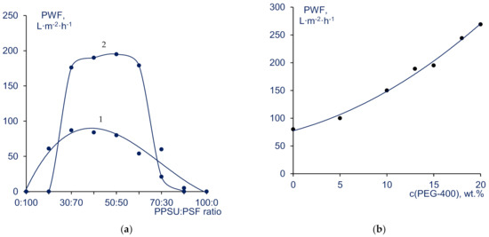 - Plisko, T.V.; Bildyukevich, A.V.; Karslyan, Y.A.; Ovcharova, A.A.; Volkov, V.V. Development of high flux ultrafiltration polyphenylsulfone membranes applying the systems with upper and lower critical solution temperatures: Effect of polyethylene glycol molecular weight and coagulation bath temperature. J. Membr. Sci. 2018, 565, 266–280. [Google Scholar] [CrossRef]