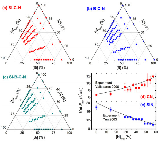Panels (a–c) show the compositions simulated. There are 16 different [Si]/[B]/[C] ratios (18 lines of datapoints including SiNx and CNx which are shown in two panels) and 13 [N]total values at each of these ratios. Some of the lines corresponding to B-containing compositions are more noisy because of keeping even number of electrons in the simulation cell. Panels (d,e) constitute a verification of the simulation technique and of the algorithm which allows the atoms to form unbonded N2. The datapoints show calculated lowest-energy inverse atomic density (V) of CNx (panel (d)) and SiNx (panel (e)) [41]. The black lines are fits to experimental densities of CNx (Equation (1) [37]) and SiNx (Equation (2) [45]). The error bars (mainly due to limited simulation cell size) represent the smallest intervals of V values which include simulations leading to (i) the two lowest energies and (ii) all other energies within 20 meV/at. from Emin, if there are any.