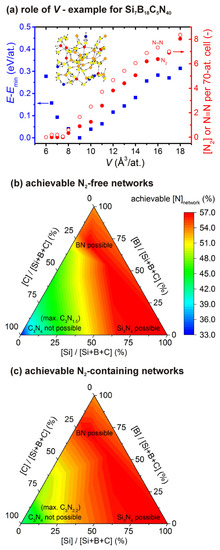 The N2 formation in itself and its dependence on V is illustrated in Figure 2a. The figure constitutes an example for the composition Si7B18C5N40 characterized by medium [Si]/[B]/[C] (complementary to extremal compositions Si30N40 and C30N40 discussed in detail previously [41]) and high [N]total. The figure shows a non-monotonic evolution of E characterized by E = Emin around V = 9 A3/at. This is combined with monotonically increasing [N2] from 0 at the highest densities (lowest V) to ≈8 at the lowest density (highest V) considered. Note that the number of triple N≡N bonds is only slightly higher than [N2], i.e., that most of N≡N bonds which are natural precursors of N2 formation indeed converted to unbonded N2 molecules. The lowest-energy density corresponds to a low but convincingly non-zero [N2]: the first fingerprint of the differences between [N]total and stable [N]network (Section 2.2) which are discussed next.