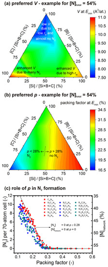 Panels (a,b) show lowest-energy inverse atomic density (V) and packing factor (p), respectively, of Si-B-C-N materials. The panels constitute an example for [N]total = 54%, leading to similar V of CNx (which increases with [N]total—Figure 1d) and V of SiNx (which decreases with [N]total—Figure 1e). Panel (c) shows the N2 formation in terms of the number of unbonded N2 molecules ([N2], left axis) and the resulting content of N which remains bonded in the Si-B-C-N network ([N]network, right axis) as a function of p. The datapoints are shown for all 16 [Si]/[B]/[C] ratios, the highest [N]total value and all p (⇔ V) values considered. The black line connects [N]network = 0 (maximum [N2]) at p = 0 and [N2] = 0 (maximum [N]network) at p = 0.28 (critical value almost independent of [Si]/[B]/[C] and [N]total).
