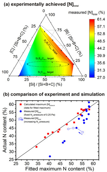 The qualitative agreement of the simulation (Figure 2b) and the experiment (Figure 4a) is complemented by their quantified comparison in Figure 4b. First, Figure 4b confirms that the calculated values of maximum [N]network shown in Figure 2b are well represented by the simple quadratic Equation (3): the median vertical distance of squares in Figure 4b from the diagonal line is less than 1% of N. Second, the figure confirms that the measured [N]total almost monotonically increases with the predicted maximum [N]network. Third, quantitatively, the measured [N]total values are well below the predicted maxima when the prediction is low, but converge to the predicted maxima when the prediction is high. In other words, the figure shows that less intensive N2 formation and loss does not only mean that the maximum N content is higher, it also means that this higher N content can be achieved in a wider range of experimental conditions. The single [N]total value which exceeds the predicted maximum [N]network may not only be due to the presence of unbonded molecules (unlikely in this particular case, taking the thermal stability [25,28] into account) but also due to a higher than estimated measurement error (the four rightmost datapoints include two almost exactly reproducing the predicted maximum, one above it and one below it) and/or the role of impurities (e.g., compressive stress and changes in network topology resulting from implantation of Ar+ ions [49]: even when [N]/([Si+B+C+N] = 61% is above the prediction, [N]/[Si+B+C+N+Ar+O+H] = 54% is below it). The role of impurities is important in various field of materials science (e.g., [51,52]) but beyond the present scope. Fourth, the empty balls in Figure 4b confirm that increasing the N2 partial pressure from 0.125 Pa to 0.500 Pa can move the measured [N]total from a value well below the prediction almost all the way toward the prediction.