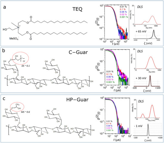 Chemical structure, second-order auto-correlation functions, size distribution and ζ-potential of (a) TEQ surfactant, (b) C-Guar and (c) HP-Guar aqueous dispersions.
