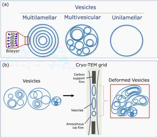 (a) Classification of vesicles according to their lamellarity; (b) schematic representation of vesicle deformation obtained by cryo-TEM when their sizes are larger than the vitrified water layer thickness.