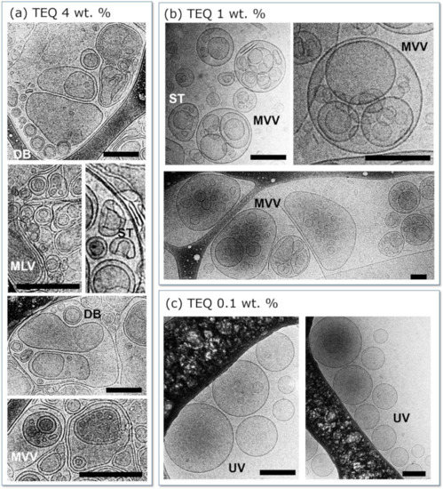 Representative cryogenic transmission electron microscopy (cryo-TEM) images of (a) 4, (b) 1 and (c) 0.1 wt. % TEQ aqueous dispersions. Multivesicular (MVV), doublets (DB), unilamelar (UV), stomatocytes (ST), multilamellar (MLV) and unilamellar (UV) vesicles are observed. Scale bars are 200 nm.