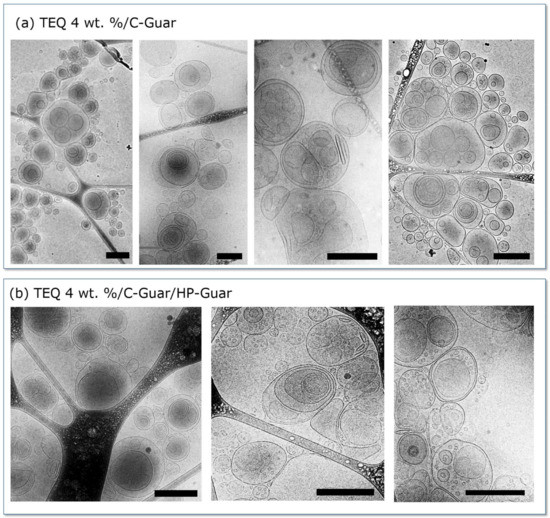 Representative cryo-TEM images of 4 wt. % TEQ in the presence of C-Guar are shown in Figure 4a. As with 4 wt. % TEQ, multivesicular vesicles are predominant after the addition of C-Guar. However, in contrast to TEQ 4 wt. %, the vesicles are smaller and appear to be aggregated, probably resulting from polymer-mediated attractive depletion interaction [50]. In the presence of both C- and HP-guars, however (Figure 4b), the vesicles are larger and less aggregated. This indicates that C-Guar causes vesicle crowding effects, while the addition of HP-Guar makes the dispersion more homogeneous. These data show that although the vesicles are stable upon guar addition, the overall structure being preserved, there are significant differences in vesicle organization and size compared to the TEQ dispersions shown in Figure 4a.