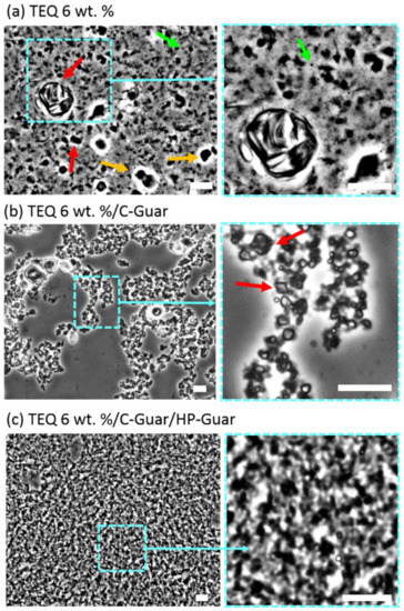 Differences induced by the guar addition on TEQ vesicle dispersion were further examined by phase contrast optical microscopy [51]. In Figure 5a, a 20× magnification image of a 4 wt. % TEQ aqueous formulation is exhibited. We observed spherical (green arrows) or faceted (red arrows) well-contrasted objects, defined as micron-sized vesicles. The faceted vesicles are likely due to mechanical stresses generated during the formulation and which remain after their formation. The faceted vesicles have been previously assigned to the organization of the alkyl chains into the bilayer in a hexagonal liquid-crystalline order, as revealed by wide-angle X-ray scattering experiments [52,53].