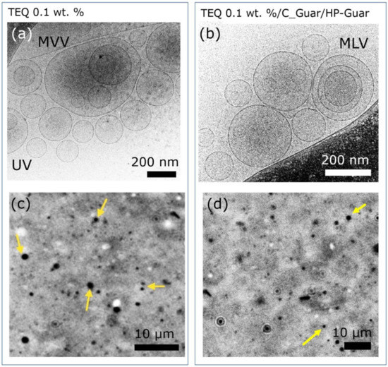 TEQ 0.1 wt. % representative cryogenic transmission electron microscopy (cryo-TEM) (a), (b) and phase contrast microscopy images (c,d), in the absence (a,c) and in the presence of guar polymers (b,d). Unilamellar (UV), multivesicular (MVV) and multilamellar vesicles (MLV) are observed.