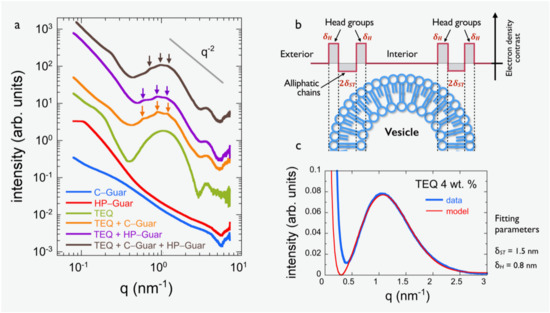The impact of guar biopolymers on vesicle properties was further examined by means of small angle X-ray scattering. The scattering cross-section of the two guar biopolymers at c = 0.6 wt. % are shown in Figure 7a. A decrease, which is expected for polymer solutions, especially a scaling law recorded at large wave-vectors (q > 0.3 nm−1), is observed. However, the q-range studied does not allow the determination of the radius of gyration of the polymers, an outcome that can be imputed to the dispersity of the chains. In contrast, for TEQ 4 wt. %, the intensity shows a broad oscillation, which can be interpreted in terms of the form factor of a surfactant bilayer [52,54], in the range 0.4–2.5 nm−1. The oscillation is here attributed to the variation of electron scattering density across the bilayer thickness. Depicted in Figure 7b, the two-level electronic density profile depends on two parameters: the size of the head groups and the thickness of the hydrophobic region . Figure 7c displays the SAXS intensity for TEQ 4 wt. % in linear scales, together with the adjustment of the bilayer form factor [52,54] using as fitting parameter = 0.8 ± 0.05 nm and = 3.0 ± 0.1 nm. Here, we used the expression provided by Kawabata et al. [52]: