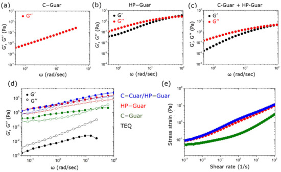 Elastic and loss modulus and as a function of the angular frequency obtained from (a) C-Guar 0.4 w. %, (b) HP-Guar 0.4 wt. %, (c) mixture of guars (ctot: 0.4 wt.%). Elastic and loss modulus and (d) and shear stress (e) obtained from TEQ 6 wt. %, TEQ 6 wt. % mixed with C-Guar (0.4 wt. %) or HP-Guar (0.4 wt. %) and guar mixture (ctot: 0.6 wt. %). The results have been obtained by rotational cone-and-plate rheometry.