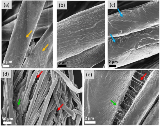 Representative SEM images of cotton fibers treated with (a) water, (b,c) TEQ 1 wt. %, (d,e) TEQ 1 wt. % in presence of guar biopolymers. The magnifications used in (a–e) are 90, 2000, 2000, 400 and 5000, respectively. Yellow, blue, green and red arrows indicate the fibrils, TEQ layer, polymer threads and TEQ/polymer films, respectively.