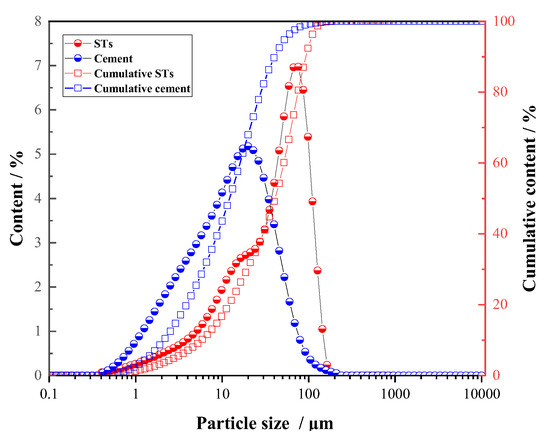 Particle size distribution curve of M32.5 cement and STs.