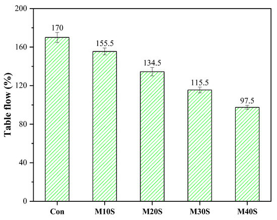 The fluidity of the fresh mortars with STs decreased with the increase in the amount of STs (Figure 4). Compared with the control group (without STs), the fluidity reductions of the mortars with STs were 8.53%, 19.1%, 32.1%, and 42.6%, respectively. The decrease in the fluidity of the mortars with STs can be attributed to the fact that STs have greater water absorption than river sand. STs absorb more water than river sand, resulting in a decrease in the free water content and lower fluidity of the fresh mortars. In addition, the SEM picture of STs, as shown in Figure 2, suggested that the ST particles were irregular prismatic, with different sizes, loose surface structure, and no densification, resulting in large friction between ST particles, which significantly reduced the fluidity of fresh mortars. Therefore, it is necessary to limit the substitution rate of STs to river sand; otherwise, an excess substitution rate will cause poor fluidity of the mortars.