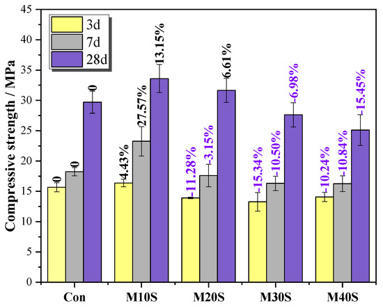 Figure 5 presents the compressive strength of M32.5 cement mortars with different amounts of STs. When the curing time increased from 3 to 28 days, the overall compressive strength of the five groups of mortars tended to increase. After adding STs, the compressive strength of mortars increased at a lower substitution rate (0~10%) but decreased at a higher substitution rate (>10%). The positive effect of STs on the compressive strength of mortars can be explained from two aspects: (1) STs replace river sand, which is equivalent to reducing the sand rate and increasing the amount of cementitious materials. In the case of constant water consumption, the water-binder ratio decreases accordingly, and the mortar structure is denser, thereby improving the compressive strength of mortar. (2) Due to the release and migration of sulfur in STs, sulfate ions generated by the reaction of pyrite assist in activating the cement auxiliary material, promote the hydration reaction, and thus improve the compressive strength of mortars [29,30].