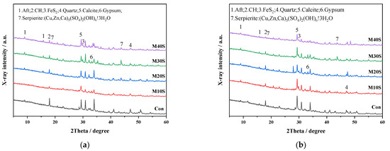 XRD patterns of hydration products of mortars with STs at different curing times: (a) 7 and (b) 28 days.