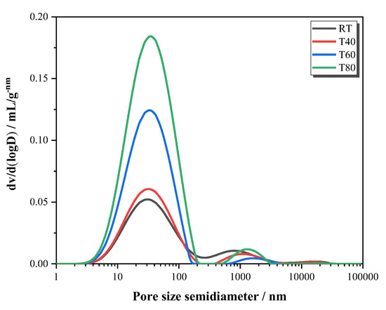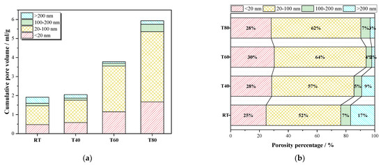 Under different curing temperatures, the hydration rate of mortar increased with the increase in temperature, but the compressive strength did not show a similar trend. Therefore, the reason for the strength change can be analyzed from the characteristics of porosity and pore size distributions because they are considered as major factors influencing the strength of mortars. The curve of the specimen at 28 days (Figure 11) revealed that the maximum continuous pore diameters of all four curing conditions were nearly the same, approximately 60 nm, which belongs to harmful pores (20–100 nm) [38,39,40]. The higher the peak value, the worse the pore distribution. With the increase in the curing temperature, the peak value of harmful pores became larger. The peak value of harmful pores of T40 was close to that of RT, indicating that the curing temperature of 40 °C had little effect on the pore distribution but increased the hydration rate, so the compressive strength increased. However, when the curing temperatures were higher, the peak values of harmful pores corresponding to T60 and T80 were larger, which were 3 to 4 times that of RT, and the pores distribution was poorer, resulting in a decrease of the compressive strength.