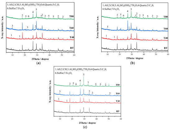 Figure 13 shows the XRD patterns of M32.5 cement mortar with STs cured for 3, 7, and 28 days at room temperature, 40, 60, and 80 °C. Ettringite and sulfate peaks were observed in hydration products of mortar cured for 3 days (Figure 13a). At room temperature and 40 °C, the hydration reaction was normal, and ettringite peaks were detected obviously at the diffraction angles of 9.091° and 15.784°. However, with the increase in the curing temperature, the ettringite peaks almost disappeared in the XRD patterns of T60 and T80, and instead a new sulfate peak was observed near 10°. Under the condition of high curing temperatures (60–80 °C), the ettringite will decompose, and a new chemical reaction will occur to form the monosulfur hydrated calcium sulfoaluminate (Afm) [42]. At the same time, Fe2O3 was found to be generated under the high curing temperature, which is because FeS2 in STs oxidated and was converted into Fe2O3 and sulfate ions that corresponded to the sulfate peak.