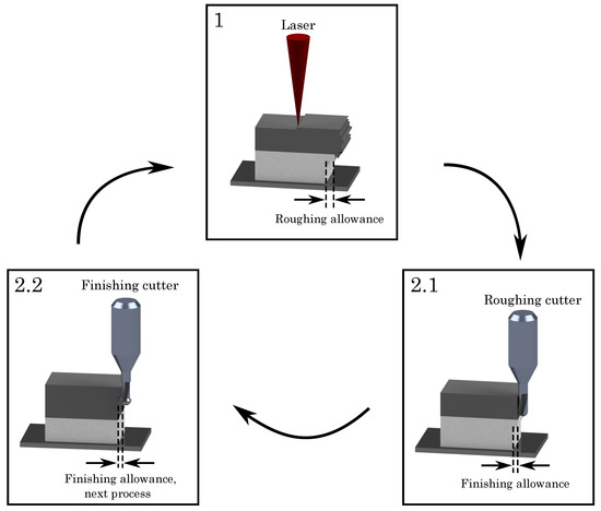 However, it is worthwhile to note that the finishing cutter starts millling from the bottom to the top and also terminates beneath the last built layers, sparing several layers for the next process cycle (cf. Figure 2 (2.2), where the finishing cutter leaves five layers). Due to the selective laser melting, a thermal gradient within the built part developes, as the top layers retain a higher temperature compared to lower built levels, where the heat has dissipated via the subjacent parts or support structures. As it has been shown by [25,39,40], under such thermal conditions it is preferential to start milling from the bottom to the top and to also stop finishing beneath the upper surface, leaving several layers beyond. By virtue of this geometrically shift, the milling process avoids thermal deformations and geometrical deviations, warranting a high surface quality.