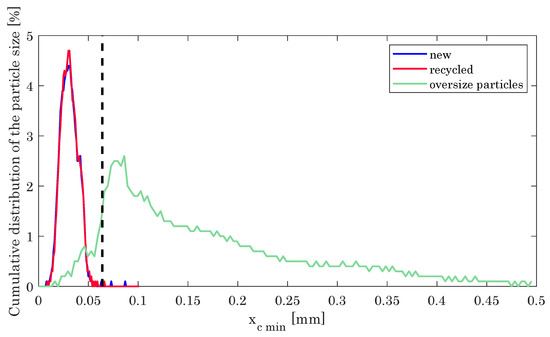 Powder distribution of new powder, recycled powder and the oversize particles.