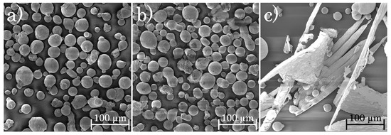 For comparison, Scanning Electron Microscope (SEM) images of the pristine, recycled and of the oversized particles are shown in Figure 4, confirming that new and recycled powder exhibit similar shape. The oversize particles, however, clearly reveal larger chips of different size and shape which can be associated to splints of the cutter and flakes of the milled steel.