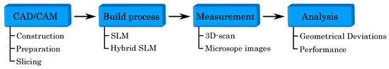 In general, the methodical approach for the systematic creation of construction rules is realized similarly for all geometrical structures, as schematically illustrated in Figure 5. For every geometry, the construction has to be prepared in a CAM-software and sliced for the building process. After that, for both, the sole SLM and the hybrid process, a batch of specimens is manufactured, typically consisting 35 to 50 specimens. The geometrical accuracy is measured with the 3D-scanner and depicted in a false colour representation, additional measurements are carried out with a microscope and images are taken. Concluding, the analysis of the geometrical deviations and the performance of the milling system is executed and the findings are represented in a construction rule for both parts of the process and summarized in Figure A1 at the end of the publication.