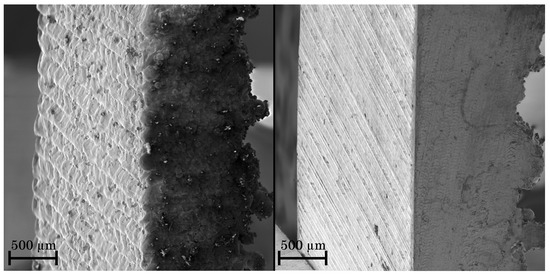 In addition to the measurement of the geometric deviation by the stripe line projection, Scanning Electron Microscope (SEM) images of the surfaces are shown in Figure 9 to characterize the staircase-effect of highly inclined parts. The figure depicts the top and the front side of specimens with 10 inclination angle; the unmachined bottom side is presented shortly on the right side of the specimens. The SLM built part on the left side of the figure exhibits misalignments between the single layers caused by the additive process, while the hybrid manufactured part on the right side shows a smooth surface, the staircase-effect itself is not identifiable and is excluded by milling.