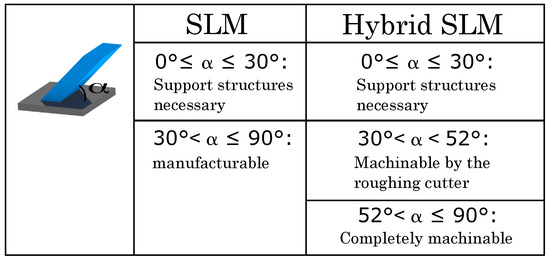 From a design engineering point of view, this concludes a design rule for the hybrid SLM process, which is shown in Figure 10. For both, the sole SLM and the hybrid SLM process regions of inclination angles are specified considering the necessity of support structures and the machinability by the milling cutters.