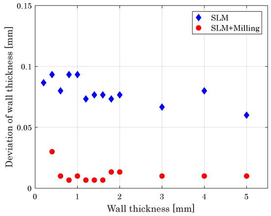 The smallest wall thickness achievable with the hybrid system, in turn, is 400 m. Thinner SLM built walls break under the milling process conditioned by the impact of the milling cutter. The milling cutter induces vibrations of the thin walls and by turning around the corner, the walls with smaller thickness get destroyed. Figure 11 compares the measured thickness deviation as a function of wall thickness for both the SLM and hybrid built parts. While the thickness deviation for SLM built parts is between 0.06 mm and 0.095 mm, the additional milling process improves the thickness deviation significantly. With a deviation of about 10 m for thickness m, the hybrid milling approach can eliminate the geometrical inaccuracy of the SLM process, one of its biggest disadvantages compared to conventional manufacturing methods [5].