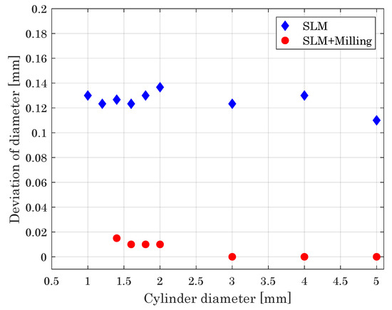 The minimum printable diameter in the SLM process is mm, with cylinders having smaller diameters gaining insufficient connection to the building plate (200 m–600 m) or being damaged during powder recoating (800 m). Employing the hybrid system, the smallest achievable cylinder diameter is mm. Due to the low resistance of the specimens, thinner cylinders, reliably built by the SLM down 1.0 mm, break during the milling process.