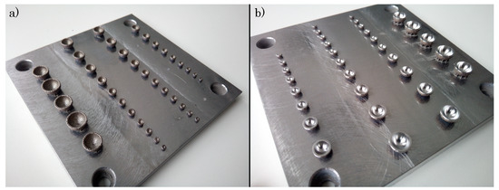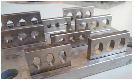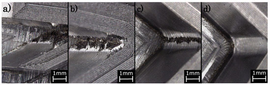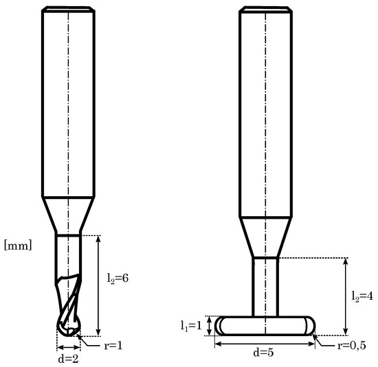 For confirming the specification in Equation (1), studying the performance of major cutters and observing the powder expulsion, the manufacturing of inner radii has been examined with the 1 mm ball end mill and the T-slot cutter. As depicted in Figure 13, the T-slot cutter has a diameter of mm in a completely plane geometry, increasing the difficulty of the powder expulsion.