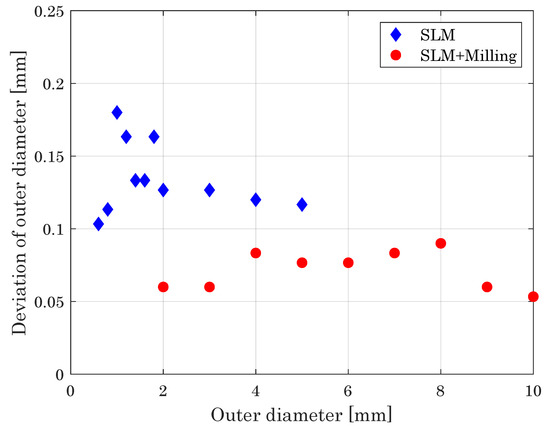 Figure 12 depicts the deviation of the measured from the designed diameter for both the SLM and hybrid built parts. While for SLM built cylinders this deviation is in the range of 0.11 mm and 0.14 mm, it is significantly reduced to about 15 m for the hybrid process, confirming that the hybrid manufacturing ensures better geometrical accuracy as provided by the sole SLM process.
