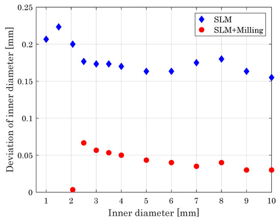 As shown in Figure 15, the geometrical accuracy of the hybrid manufacturing approach exceeds the generated accuracy in the sole SLM. In addition, Figure 16 depicts the milled spheres in contrast to the SLM-built objects to distinguish the superior smoothness of the hybrid process. Furthermore, the results reveal that the minimum manufacturable inner diameter of 2.06 mm is fabricated reliably without high deviations.
