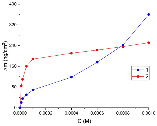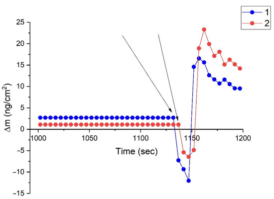 The addition of a small amount of DAS in water, corresponding to a concentration of 1 × 10−5 M, first led to a slight decrease in the mass of the sample, followed by an increase in mass (Figure 1, curve 1). Similarly, the introduction into the solution of VS at the same concentration led to an initial decrease in the mass of the sample (Figure 1, curve 2). The decrease in the mass of the sample was insignificant at 17.5 and 24.7 ng/cm2 for DAS and VS, respectively. Similar effects have previously been observed on copper [4] and have also been observed in the adsorption of corrosion inhibitors on the surface of iron and gold [31].