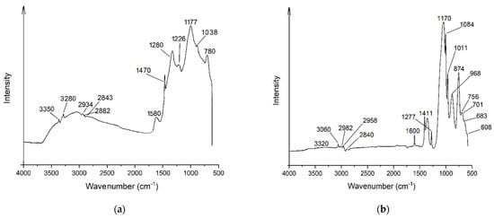 In Figure 3a, the IR spectrum for DAS contained a contour of the absorption bands of valence oscillations νNH (3350 and 3280 cm−1), as well as the maximum absorption bands of deformation oscillations δNH in the primary amino group (at 1580 cm−1). Differences could also be distinguished between oscillations of CH–groups: valence (νCH, maximum 2934 and 2882 cm−1) and strain (δCH2, 1470 cm−1). The absorption band of νCH in methoxy groups (at 2843 cm−1) was also recorded. The methoxysilane group was registered: the maximum absorption of oscillations 1177 cm−1 C–O, and 1038 cm−1 Si–O. Maximums at 1280, 1226, 1038 and 780 cm−1, corresponded to the absorption region of C–Si bonds. In the case of VS, because of the presence of a double bond, the properties of this organosilane changed significantly compared to DAS. As shown in the Figure 3b, there was an intense characteristic band of absorption of valence oscillations νCH from the methoxy group 2840 cm−1. The maxima at 2958 and 2982 cm−1 characterized the absorption of valence oscillations of the CH in several groups –O–CH3. The absorption band of hydroxyl groups had a slight intensity; protons at double bond gave low intensity absorption bands with maxima at 3060 and 3022 cm−1. An intense wide absorption band of associated OH–groups (at 3320 cm−1) was also recorded. In the IR spectrum of a VS, the absorption bands of the vinyl group (1600, 1411, 1011, 968 cm−1) and Si–O bonds (1084 cm−1) were recorded. Intense absorption bands at 1170, 874, and 756 cm−1 indicated C–O and Si–C bonds in the sample. During hydrolysis, VS on Al surface led to the breakage of the –O–CH3 bond with the formation of methanol groups –Si–OH, which formed covalent bonds with the metal. This was evidenced by the increase in absorption below 700 cm−1 in the infrared spectrum.