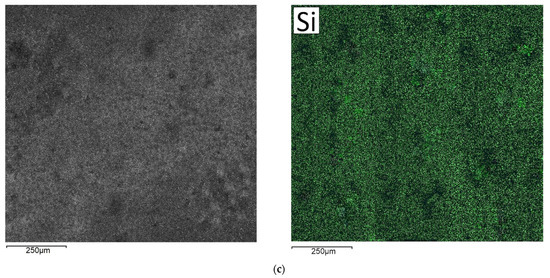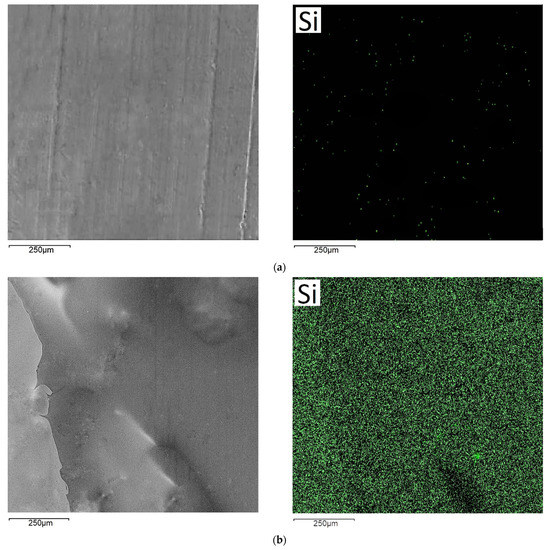 The SEM and EDS results are shown in Figure 4, which showed the uniform application of both organosilanes compared to the unmodified surface. This was evidenced by the silicon distribution map taken in the X-ray Kα line Si. Thus, the outer layer of the films consisted of siloxane groups that arose as a result of the polycondensation reaction. Subsequent exposure to temperature led to the formation of a denser structural network, similar to polymer films [8,9,11,26]. The thickness of the formed films for DAS was 1.2–1.9 μm, and for VS was 0.5–0.8 μm.
