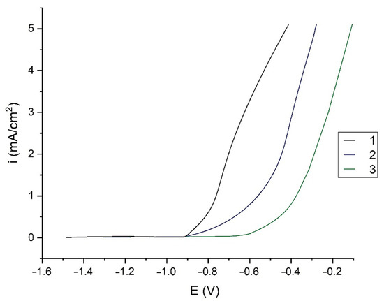 Anode polarization curves with formed organosilane films on the surface of aluminium and clean metal in a solution of 0.4 M H3BO3 + 0.1 M Na2B4O7 + 0.01 M NaCl pH 6.7: (1) clean Al; (2) Al + VS; (3) Al + DAS.