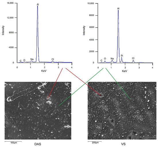 Figure 6 showed that after the influence of anodic polarization, organosilane films were preserved on the metal surface. After removing the anode polarization curves in the films, there were defects in the form of pores. Therefore, in the case of VS, the film had a loose structure, and the maximum pore size was 15 μm. In the case of DAS, the film adhered more evenly to the aluminium surface, and the pore size was 9 μm. The results of the corrosion tests are presented in Figure 7 and Table 2.