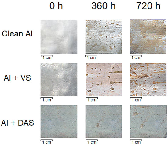 Figure 7 demonstrated that after 720 h of exposure of samples in the climate chamber, local defect formation was recorded on the surface of all materials. A comprehensive assessment of the results presented in Table 2 showed that the system Al + DAS exhibited the best efficiency in these conditions. This was consistent with the previously obtained electrochemical results. Intermediate results of the system Al + DAS after 360 h of exposure showed a value of 0.1%, which was 10 times better compared to the system Al + VS. Furthermore, in descending corrosion resistance, it was possible to arrange the systems as Al + VS and clean aluminium.