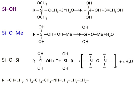 Once in the water, first, hydrolysis of molecules of organosilanes occurs with the formation of silanols ≡Si─OH. In parallel, condensation of silanol and surface hydroxyl groups of the metal occurs with the formation of surface metal–siloxane bonds ≡Si─O─Me. Finally, condensation of neighbouring silanol groups occurs to form the siloxane oligomer ≡Si─O─Si≡. The degree of oligomerisation n can vary from two to several hundred groups per square nanometer. In this case, given the density of hydroxyl groups on the surface and lengths of the Si–O bonds equal to 1.61 Å, n is in the range of 4–18 groups/nm2 [27]. Thus, summarizing the above experimental data, it can be assumed that the outer layers of organosilane films have polymer-like structures. Similar data are presented in the literature [8,26].