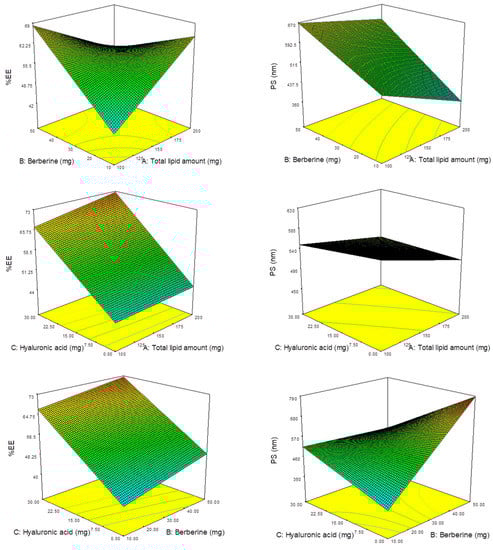 Three-dimensional (3D) response surface plots showing the effect of the independent variables on liposomes particle size and entrapment efficiency percent: A—total lipid amount (mg), B—berberine (mg), C—hyaluronic acid (mg).