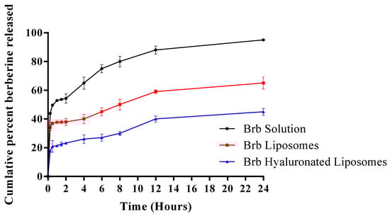 Cumulative in vitro release of berberine from different berberine formulations in phosphate buffer saline (pH 6.8), each result is the mean of three determinations ± SD.