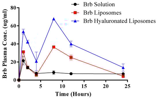 In addition, approximately 2.26- and 4.38-fold increases in relative bioavailability were achieved within Brb liposomes and Brb hyaluronate-based liposomes, respectively, when compared with the free Brb solution. Results of pharmacokinetics studies indicate that the oral bioavailability of Brb was increased and the entrance of Brb into the bloodstream was accelerated upon its encapsulation into vesicular system. The obtained results are accredited to the lipophilic nature of the prepared system, resembling the bio-membrane, in addition to the vesicles small size that enhances intestinal penetration [32].