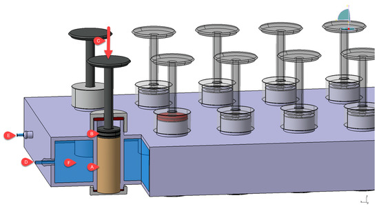 Scheme of the device used for delivering the temperature shocks under the load (A—sample chamber filled with fertilizer; B—piston; C—load; D—water inlet; E—water outlet; F—water circulation chamber).
