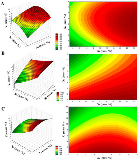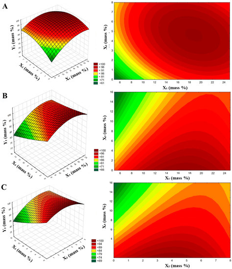 Based on the results presented in Table 2, a statistical assessment was made for analyzing the effect of the composition of coating agents on the prevention of caking of granulated fertilizers. The interpretation consisted of two parts. The first determined the relationship between the composition of the coating agents and EPC parameter of the coated fertilizers. Figure 2 and Figure 3 show the response surface plots and contour charts. The three-dimensional plots describe responses as a function of two independent variables. For each of the figures, the third independent variable was constant and defined by a middle-level value, marked in Table 1 as 0.