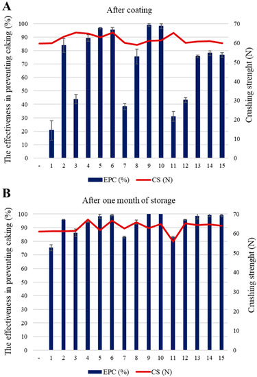 The effectiveness of anti-caking coatings and the crushing strength of granules: (A) after coating; and (B) after one month of storage.
