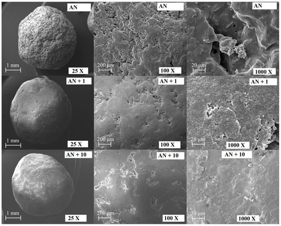 SEM images of uncoated AN fertilizer (AN) and AN fertilizers coated with 1 (AN + 1) and 10 (AN + 10) coatings. The image of each sample is shown at a magnification of ×25, ×100, and ×1000.