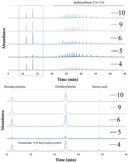 The obtained GC spectra showed that all of the five tested coatings (4, 5, 6, 9, 10) had in their composition only peaks originating from the ingredients introduced into the mixture. Coating 4 was the only one of the GC–MS-tested samples to have a surfactant in its composition, which consisted mainly of octanamide, N,N-bis(2-hydroxyethyl). It is only in this shell that the peak of this compound appeared in the chromatogram. The C16 amine and C18 amine peaks occurred in all coatings of varying intensity depending on the amount of a given compound incorporated into a particular formulation. Stearic acid was not included in formulation 9 as confirmed by the GC–MS analysis (no peak at this point). These compounds were identified both by comparison with the MS database and GC–MS spectra obtained for the individual raw materials used in the preparation of coatings. The peaks for the individual compounds are marked in the chromatograms (Figure 6). Those with a retention time of 20–40 min were derived from the slack wax used to develop the test preparations. These are hydrocarbon peaks with a hydrocarbon chain length of C20–C40. Only this area in the chromatogram is not identical for the intensity of the individual slack hydrocarbons, due to the heterogeneity of slack wax.