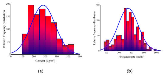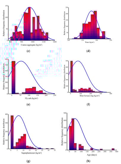 Relative frequency distribution of input parameters: (a) Cement; (b) Fine aggregate; (c) Coarse aggregate; (d) Water; (e) Fly ash; (f) Blast furnace slag; (g) Superplasticizer; (h) Age.